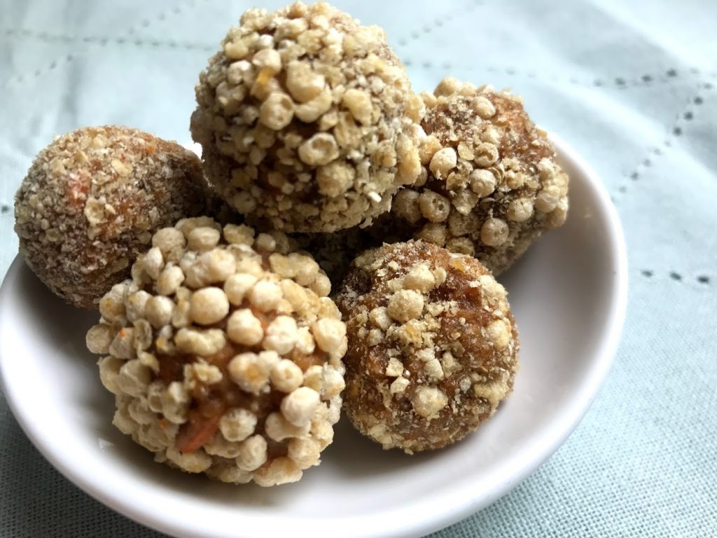 Sollte der Teig zu klebrig und matschig sein, fügt einfach noch mehr Weetabix hinzu. Die Vollkorncerealie macht den Knusperkugelteig fester. Im Endeffekt könnt ihr mit der Hinzugabe oder dem Weglassen von mehr oder weniger Weetabix selber bestimmen, wie fest die Kugeln werden sollen. Bedenkt allerdings, dass die Knusperkugeln im Kühlschrank noch kompakter werden. Formt aus dem Knusperkugelteig etwa 30 Kugeln und rollt sie in euren Handinnenflächen zu runden kleinen Pralinen. Schnappt euch anschließend eine kleine Schüssel, gebt die Soja Crispies oder den gepufften Quinoa hinein, stampft die Kügelchen mit einem Glas etwas kleiner und rollt nun die Möhrenkuchen Kugeln darin bis sie von allen Seiten ummantelt sind.