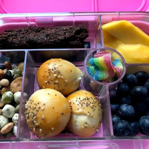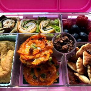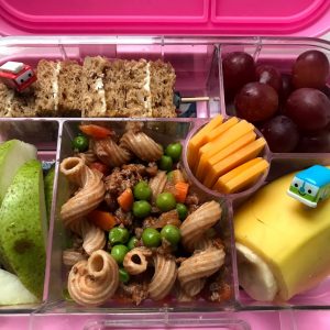 Unser wilder Geburtstagsmonat ist rum und die Restsüßigkeiten endlich alle verputzt. Entsprechend gesund und kunterbunt sieht’s in unserer heutigen Lunchbox aus: Vollkorn Nudeln mit selbstgemachter Bolognese inklusive Erbsen und Möhren, Cheddar Käse, Birne, Kiri Erdbeermarmeladen Vollkornsandwiches, rote kernlose Weintrauben und…